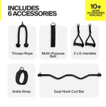 • 6-piece accessory kit: D-Handles (x2), Triceps Rope, Curl Bar, Ankle Strap, Multi-Purpose Belt