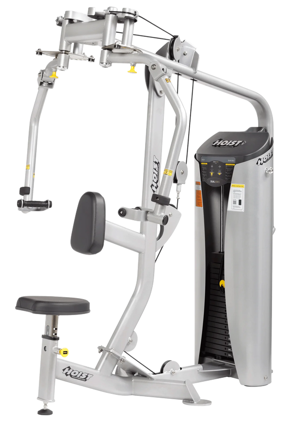 The HOIST® Pec Fly/Rear Delt swiveling handles with pivoting hand grips, provide a variety of hand positions for both exercises. Easy to reach range-of-motion adjustments for both arms with 11 positions come standard. Each exercise arm has dual pivots, allowing users to define their own exercise path. And with seven seat pad adjustments, users of all heights can easily find a safe and comfortable position for both exercises. Unique features such as patented Silent Steel® Weight Racks make HOIST® HD Dual Series the stand-out choice for prestigious gym brands, hotels and universities around the world.
